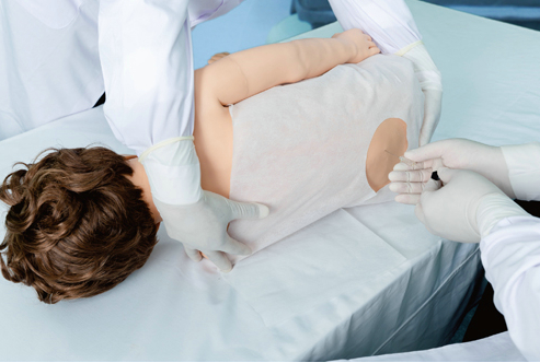 模拟5岁儿童,解剖结构正确,体表骨性标志清楚,关节活动灵活,设计了韧带阻力感和落空感、操作手感真实可信,可进行儿童腰椎穿刺训练。