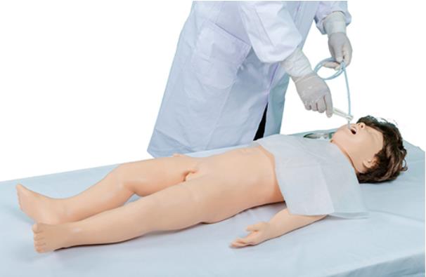 模拟5岁儿童,解剖结构正确,体表骨性标志清楚,关节活动灵活,设计了插管操作自动检测功能,可进行儿童洗胃术、胃肠减压术、胃液采取术的训练。