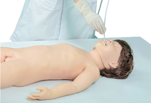 模拟5岁儿童,口腔、鼻腔、咽喉的解剖结构完整,头颈部体表骨性标志清楚,颈部关节活动灵活,可进行常规吸痰训练、经鼻气管深部吸痰训练、吸氧训练和口腔护理训练。